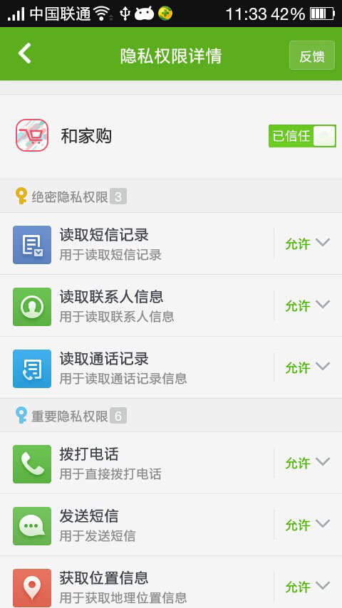 5.进入和家购软件权限详情,如显示是“未信任”状态则点击该按钮