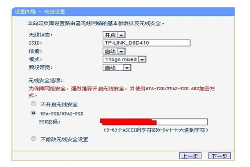 然后下一步后进入到的是无线设置,我们可以看到信道、模式、安全选项、SSID等等,一般SSID就是一个名字,你可以随便填,然后模式大多用11bgn.无线安全选项我们要选择wpa-psk/wpa2-psk,这样安全,免得轻意让人家破解而蹭网。