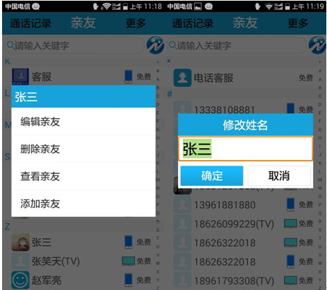 【通话记录】界面中长按需要编辑的联系人,直至跳出对话框。选择【删除】删除该联系人通话记录;选择【查看】查看该联系人完整联系记录。
