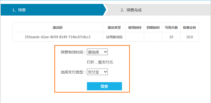 (2)按照提示选择续费有效时间及支付方式→点击【续费】