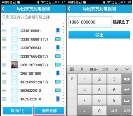 2、勾选需要导出的亲友->确定【导出】->选择盒子号码